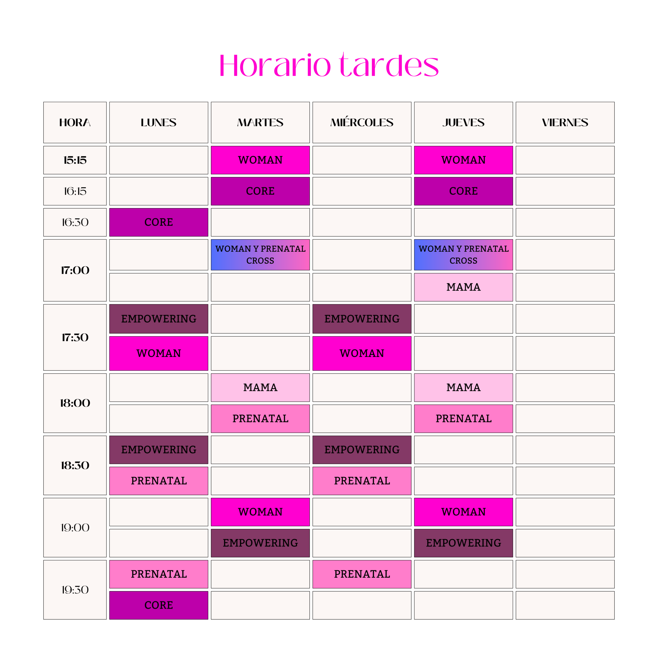 - Core y Suelo pélvico: Clase impartida por Fisioterapeuta de Suelo Pélvico donde trabajaremos la faja abdominal y el suelo pélvico